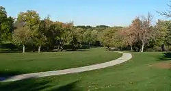 In 1912 a local businessman donated a totem pole to the park that stood there through the 1930s,[12] and the park was the site of camping grounds through the 1950s.[13] The Elmwood Park Golf Course was opened in 1916, and featured ravines, grassy fields and roadways throughout.[14] By 1917, the park had grown to 208.13 acres (0.8423 km2), and it was the second largest in the city. From the late 19th century through the 1930s an annual park was held for Omaha's African American community at the park, with as many as 10,000 people attending.[15] In 1933 an artificial island was built in the park to house a small population of Rhesus macaques from the Henry Doorly Zoo. After on escape and numerous attempts, the island was removed, and the monkeys returned to the zoo.[16] The University of Nebraska at Omaha relocated from its North Omaha campus to a 30-acre (120,000 m2) parcel next to the park in 1937, sealing the park's size permanently. In the 1940s native Omaha billionaire Warren Buffett set up a golf ball stand at the golf course in the park.[17] Renovated again in 1987, the city spent $100,000 from a bond issue to replace windows and repair restrooms at the pavilion. The park received a $1 million renovation in 1993, and in 2000 the Peter Kiewit Foundation made a significant grant to the city that allowed the city to renovate the park's historic spring area, improve the swimming pool and create new entrance signage.