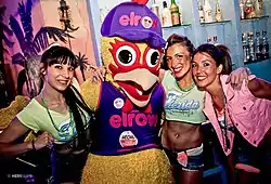 elrow's official mascot is a yellow chicken in lilac clothes named Rowgelia.[16]