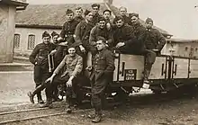 The track was laid in 1900 and inaugurated in 1901. Since 1918 German 0-8-0 brigade steam locomotives of the Heeresfeldbahn were used on the line.[1] The railway was subsequently nicknamed Elijah's Chariot of Fire (Feuriger Elias) and used for goods and passenger trains.[2] Reverend Pietkin was not amused by the increasing alcohol consumption and prostitution around the railway station, when he warned from the pulpit about the railway's curse with the aphorism: "C'est le chemin de l'enfer!" ("This is railway to hell!")[3]