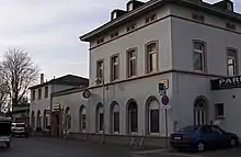 The reception building is a two-storey stucco building with a hipped roof, with lower annexes at both ends.