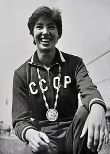Elvīra Anatoļjevna Ozoliņa (Russian: Эльвира Анатольевна Озолина, born 8 October 1939) is a retired Soviet javelin thrower. In 1960 she won gold medal with an Olympic Record of 55.98 m and was awarded the Order of the Red Banner of Labour. Between 1960 and 1963 she set three world records. In 1964 she became the first woman to surpass 60 m (61.38 m, at Soviet Championships), but this result was not ratified as a world record by IAAF. In the 1964 Olympic final she fouled her last four attempts and finished in a disappointing fifth place. Domestically she won the national title in 1959, 1961–62, 1964, 1966, and 1973.[1][2]