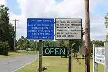 The ferry travels a distance of 110 yards,[4] shore to shore, with a travel time of five minutes,[5] has a maximum capacity of two cars or four tons by weight, operates without a toll, and operates daily, providing service from 6 am to 6 pm, Spring and Summer, and from sunrise to sunset in the Winter and Fall.[6] There is no ferry service on Christmas Day or on days of high water or storm conditions. Vehicles arriving on the opposite shore from the ferry, summon the ferry by blowing their horn. Ferry traffic averages 60 to 80 vehicles daily.