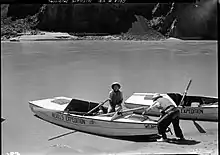 Clover and Jotter made plant lists and collected specimens throughout the trip, although the rigors of the journey—especially lack of space and difficulty keeping specimens dry—meant that they ended up with fewer specimens than they had hoped.[12] They described the canyon as having five plant zones, from the moist sand along the river's edge up to higher zones with shrubs and trees.[13] Most of what they found were typical riparian species, with a major exception being tamarisk, a non-native species that they saw in a few locations.[14] They found very little snakeweed, which has since become common throughout the canyon. Their survey remains the only comprehensive one of the river's riparian species in the era before Glen Canyon Dam was built.[13] After the trip, Clover and Jotter published the botanical findings of the trip in a 1944 issue of American Midland Naturalist.[15]