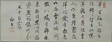 Ema and Rai San’yō met two more times that year. Through enquiry by her father, Ema became Rai San’yō's kanshi and calligraphy student to improve her verses.[5] The exact nature of her feelings towards Rai San’yō remain unclear, as well as the circumstances of a potential union between the two. Some scholars believe that Rai San’yō did not ask her father for her hand in marriage, assessing himself – disowned by his father and with a struggling reputation – to be of no status to become marry into the prestigious Ema family. Other scholars assess that in her absence, Rai San’yō did ask Ema Ransai for Ema Saikō's hand in marriage. Following this version, Ema Ransai, adhering to Saikō's previous rejection of marriage in favour of her art, rejected Rai San’yō without the knowledge that the feeling might have been mutual.[1] In any event, Rai San’yō married Rie, his seventeen-year-old maid, soon after. Ema Saikō remained his student until he died, mainly through correspondence. For teaching calligraphy, Rai San’yō would send her poems that he or other writer composed for her to copy them and send back the result for his inspection. Similarly, she sent him her composed Kanshi which he then would assess and return with his comments. The intimacy of their correspondence and the poems they wrote about each other has prompted speculation about a relationship which was more than platonic; while these primary sources do show closeness and positive feelings, there is no concrete evidence to support these claims and their exchange has not been judged as scandalous by their contemporaries.[5]