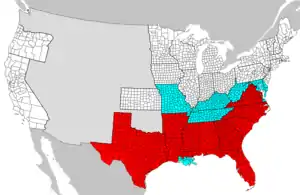 The Emancipation Proclamation did not free all slaves in the U.S., contrary to a common misconception; it applied in the ten states that were still in rebellion on January 1, 1863, but it did not cover the nearly 500,000 slaves in the slaveholding border states (Missouri, Kentucky, Maryland, and Delaware) or in parts of Virginia and Louisiana that were no longer in rebellion. Those slaves were freed by later separate state and federal actions.[23] The areas covered were "Arkansas, Texas, Louisiana (except the Parishes of St. Bernard, Plaquemines, Jefferson, St. John, St. Charles, St. James, Ascension, Assumption, Terrebonne, Lafourche, St. Mary, St. Martin, and Orleans, including the city of New Orleans), Mississippi, Alabama, Florida, Georgia, South Carolina, North Carolina, and Virginia (except the forty-eight counties designated as West Virginia, and also the counties of Berkley, Accomac, Northampton, Elizabeth City, York, Princess Ann, and Norfolk, including the cities of Norfolk and Portsmouth)."[24]