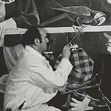 Romano has paintings in the Indianapolis Museum of Art,[9] Metropolitan Museum of Art, the Boston Fine Arts Museum, the Fogg Museum and the Musée Nacional de France. Recently his work has been added to the Florida Holocaust Museum collection. His notable works include his holocaust allegorical paintings as well as portraits of Marianne Moore, his father[3] and William Carlos Williams.[6] Romano created a portrait of T.S. Eliot[6] as well as woodcuts to illustrate an edition of Eliot's The Waste Land.[10]