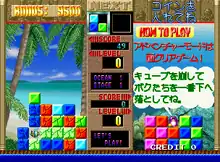 This game has three modes of play; Adventure, Normal, and Versus. In all three modes, both players must line up blocks of a particular colour - and when three blocks have been lined up (vertically), they will crack. Once a fourth block of that same color lands on the three cracked ones, they will all shatter; for Adventure Mode, the object is to get the trapped sea creatures down to the bottom of the screen. After each ocean has been cleared, the player receives an item which can be activated by pushing the stick up and pressing the button - however, each item can only be used once, and only in the ocean that follows the one it was received at the end of. At the end of the "Mystic Ocean", the player has to defeat a sea demon named Jamir, by cracking the block he is possessing with his face; he will then go on to possess a different block, and once the blocks he possesses have been cracked six times, he will be defeated. However, the game is not over at this point - as there is still one more stage that has to be cleared (called the "Escape Stage"), where the player must get seven pink dolphins and one blue one (which appear as part of the block groups) down to the bottom of the screen.
