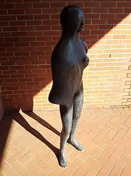 Emergence is a cast bronze sculpture depicting a woman with long hair flowing down to her right upper thigh. Her hair is parted and covers both of her eyes. The statue is 68 inches (1.7 m) tall and weighs approximately 130 pounds.[2] Eckland has described the work as a "young woman... poised at rest just prior to departing... [S]he is indeed ready to emerge."[1]
