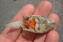 Emerita has a short lifespan, perhaps no more than two to three years, and can reproduce in its first year of life.[7] The eggs are bright orange, and hatch into larvae, which may live as plankton for more than four months and can be carried long distances by ocean currents.[7] The number of zoeal stages varies between species from six to eleven.[2]