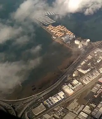 The Emeryville mudflats are officially known as the Emeryville Crescent, lying west of the Eastshore Freeway (I-80), south of the Emeryville Peninsula, and north of the Bay Bridge toll plaza mole. They are bisected by the mouth of Temescal Creek.[2] The Emeryville Crescent is a northern coastal salt marsh which supports cordgrass, pickleweed, eelgrass, and saltgrass; the endangered Ridgway's rail is known to reside in the Crescent.[3]