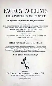 In 1887 Garcke and the accountant John Manger Fells (1858-1925) published their book Factory accounts, their principles and practice. In the preface of the second edition they presented their work as the "first attempt to place before English readers a systematised statement of the principles regulating Factory Accounts ; and of the methods by which those principles can be put into practice and made to serve important purposes in the economy of manufacture."[11]