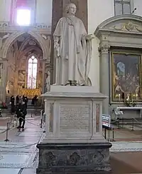 In Florence, he completed the bas-relief for the tomb of the Countess of Albany in Santa Croce, Florence; the Countess' statue was completed by Luigi Giovannozzi.[2] Also for pantheon- former church of Santa Croce, Santarelli in 1836 sculpted the monument to Giovan Vincenzo Alberti, former minister to the Grand-Dukes of Tuscany. This statue was commissioned by Giovan Vincenzo's son, Leon Battista Alberti, who also commissioned the monument to his famous ancestor of the same name, which is located across the nave and sculpted by Lorenzo Bartolini.[3] He also completed in 1838, a bas-relief for the funerary monument of the painter Francesco Sabatelli.