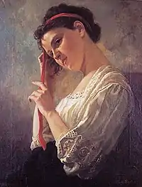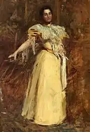 Sartain set up a studio in Philadelphia in 1875 where she created paintings and engravings.[23] Over the course of her career she made copies of paintings in Spanish and Italian galleries, portraits, genre paintings,[20] and was the first woman to practice the art of the mezzotint in the United States and Europe.[2][4][24] Among her works were period scenes that depicted submissive women with downcast eyes as in Italian Woman and The Reproof.[25] Sartain exhibited her works in cities along the East Coast of the United States[13] and was the only woman to win a gold medal at the 1876 World Fair in Philadelphia[4] for The Reproof.[2] She won the Mary Smith Prize for best picture by a woman at the 1881 and 1883 Pennsylvania Academy of Fine Arts exhibits.[20] Sartain worked as art editor for the paper Our Continent from 1881 to 1883.[2][26] She was then the art editor for New England Bygones (1883) by Ellen C. H. Rollins.[2] Joseph M. Pennell said that Sartain was "the only trained woman art editor I ever knew".[26] Sartain exhibited her work at the Palace of Fine Arts and at the Pennsylvania Building of the 1893 World's Columbian Exposition in Chicago, Illinois.[27]