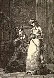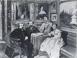 In 1870, Sartain met Mary Cassatt in Philadelphia and the following year they left for Paris, London, Parma, and Turin to study painting.[18] The women spent the first winter in Italy[10] and studied printmaking with Carlo Raimondi, who taught engraving at the Academy of Fine Arts in Parma.[18] Sartain spent the rest of the four-year stay in Paris[10] and studied under Évariste Vital Luminais.[2] She shared a studio with Jeanne Rongier. Florence Esté, Sartain's friend, also worked in the studio occasionally. The women copied each other's work and provided one another with criticism and encouragement.[19] Two of Sartain's paintings, a genre painting Le Piece de Conviction (The Reproof) and a portrait of Mlle. Del Sarte, were accepted at the Paris salon in 1875.[18][20] Sartain returned to the United States that year,[18][lower-alpha 1] when she ran out of money. Harriet (Hattie) Judd Sartain, who was her brother Samuel's wife and a successful homeopathic physician, had lent Emily Sartain money for her education. Emily believed Hattie was likely to continue to help with education expenses in Philadelphia where expenses were lower and she would more likely sell her works.[22]