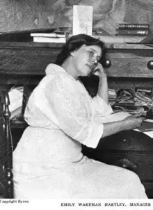 Emily Wakeman Hartley was the founder, fundraiser, and manager of the Stamford Theatre,[5] which opened in 1914.[6] It became a popular venue for touring performers and for new shows, before they debuted in New York.[7][8] She also lectured on creativity, saying "One of the great faults of the present generation is that too few make use of their gray matter; I mean that they do not seem to realize that they have something within themselves, and do not need to depend wholly upon outside matters for amusement. And a person who always has to be amused or entertained cannot be happy, for he hasn't the creative spirit."[9]