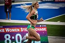 She is a three-time Olympian making the US team in 2012, 2016 and 2020. At the 2016 Olympic Games in Rio she captured the bronze medal becoming the first American woman to medal in an Olympic steeplechase event.[5] Her finishing time of 9:07.63 established a then-new American record.