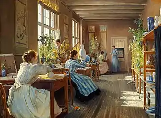Most of her landscape motifs are taken from the area around Silkeborg. She also painted flowers and portraits. Her painting of women working at the Royal Porcelain Factory was displayed at the Charlottenborg exhibition of 1895, and purchased by the art association. From 1885 until her death, she held numerous showings at the Kunsthal Charlottenborg. Her painting of women working at the Royal Porcelain Factory was displayed there in 1895, and purchased by the art association. That same year, she participated in the Women's Exhibition, in Copenhagen.[1]