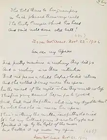 Sharp's income was derived after 1905 largely from lecturing and publishing folk music.[4] Overd's songs Bruton Town, Wraggle-Taggle Gipsies, Sweet Kitty and Geordie were included in the first volume of Sharp's and Marson's Folk Songs from Somerset[2] which was published in 1905.[6] Her songs The Crabfish, Briery Bush and New Year's Song were in his later volumes.[2] Sharpand Overd met five times over the next eleven years and Overd introduced him to other folk singers she knew.[1]