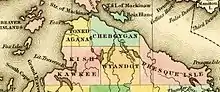 The Odawa were important prior to European colonization for their trading network throughout the Great Lakes area. The Odawa of nearby L'Arbre Croche fished, hunted, and grew and gathered produce, including corn, squash, onions, cucumbers, turnips, cabbages, melon, and wild strawberries.[6] The Odawa bartered with the French at Mackinac Island, a major fur-trading center where Lake Huron meets Lake Michigan. They traded food, bark, and canoes for goods – like clothing and glass and porcelain beads. The canoes and food, including dried fish and meat and produce, supplied the fur traders who worked in the wilderness of the Great Lakes and the Upper Mississippi regions.[7] They retained this influence into the 18th century, as French traders relied on them to take furs east from tribes they traded with to the north and west. When French explorers first came to this area, they claimed it as part of New France, based in today's Quebec province.