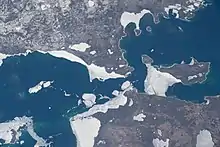 According to the US Census Bureau, the county has a total area of 882 square miles (2,280 km2), of which 467 square miles (1,210 km2) is land and 415 square miles (1,070 km2) (47%) is water.[12] The lower portion of the county forms Little Traverse Bay at the mouth of the bear River. Emmet County is considered to be part of Northern Michigan
