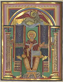 Despite its name, the Emperor's Bible is not a full Bible but a Gospel Book.[2] It also contains Jerome's preface to the gospels, short prefaces ahead of each individual gospel, illuminated canon tables and pericopes, short texts used for specific festivals. All the text has been written by a single scribe in the script known as Carolingian minuscule.[2] The book contains 159 folios or leaves, each measuring 38 centimetres (15 in) by 28 centimetres (11 in).[3] The folios are made from high quality vellum and the manuscript is generally very well preserved.[3]