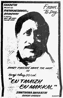 En Thamizh En Makkal (transl. My Tamil, My People) is a 1988 Indian Tamil-language political drama film directed by Santhana Bharathi. The film stars Sivaji Ganesan, Vadivukkarasi, Nizhalgal Ravi Chinni Jayanth and Major Sundarrajan. It was released on 2 September 1988.[1]