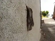 The wingspan is about 70 mm. Adults have a streaky speckled fawn pattern on their wings. The abdomen is banded in brown and grey.[2]