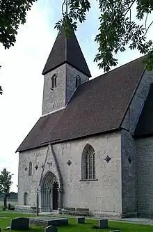 The presently visible church was preceded by an older, Romanesque church. Of this church, only the tower, built in the 12th century and heightened in the 14th, remains. A few stone sculptures have also been re-used in the later church, e.g. one sculpture depicting a dragon and another a lion. These are now immured in the southern façade of the church. The rest of the church dates from the 13th century (the choir and sacristy) and the early 14th (the nave).[1] The building material of the church is limestone.[2]