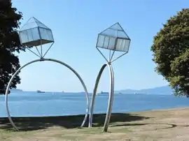 Engagement, installed at Sunset Beach in 2005, depicts two diamond engagement rings and stands nearly 30 feet tall. The diamonds, illuminated and tilting away from one another, are composed of translucent plexiglass boxes, steel and aluminum.[1] The Vancouver Biennale described the sculpture as pop art. Engagement is one of several sculptures by Oppenheim that has been installed in Vancouver: The Device to Root Out Evil an upside-down aluminum church, was installed along the waterfront in Coal Harbour from 2005 to 2008, and Arriving Home was displayed within Vancouver International Airport as part of the 2009–2011 Vancouver Biennale.[8]