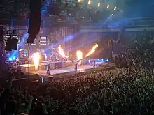 When performed on stage, flames were shot into the air, and Schneider's drumsticks would shoot sparks. In the "Live aus Berlin" shows, Bobo joined Rammstein to sing her parts from inside a flaming cage, instead of the usual pre-recorded chorus used in most of the shows. Having been excluded in the entire Reise, Reise tour, "Engel" returned to the setlists as the closing song of the Liebe ist für alle da tour, taking place during 2009 and 2011. This time around, vocalist Till Lindemann sang the chorus instead of Bobo's pre-recorded lines. For the pyrotechnics, Lindemann wears a set of angel wings that shoot flames from the tips and have sparks go off along them.[2] "Engel" was the penultimate song on the setlist during the Made in Germany 1995-2011 tour, and the tour in 2016.