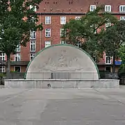 At the extreme far end of the central axis, opposite the main entrance, stands a bandstand. It was designed by later famous Danish Modernist architect and designer Arne Jacobsen who spend his two first years after leaving architecture school working at Poul Holsøe's office. It is one of his only Neoclassical works. A year later he opened his own practice and built his first Modernist building. The bandstand is decorated with figure reliefs by Aage Nielsen-Edwin, depicting Apollo and the Nine Muses.[2]