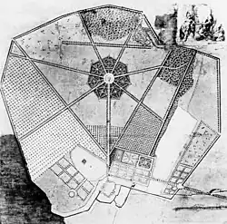 Thanks to engravings made by Romeyn de Hooghe around 1680, we can have a view how the gardens were at that time.[2] There were fountains, pavilions, triumphal arches, statues, mountains, an orangery, a theatre, artificial caves and other follies. In the centre of the gardens a seven-sides pavilion was constructed, which served both as a temple of Hercules and an observatory. The viewing terrace was reached by a movable windlass staircase. The basin around the pavilion contained water that, according to the principle of communicating vessels, provided the necessary water pressure for the fountains and other hydraulic elements in the park. Seven large and seven small allees departed from the pavilion, each with its own tree species and landscape. The small avenues always led to a "bulwark" where a god statue stood. The whole was imbued with cosmological significance.