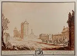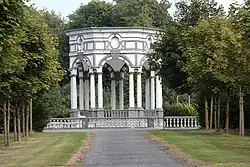 During a hunting party in 1775, Louis Engelbert, 6th Duke of Arenberg (1750–1820) was hit in the face by a shotgun and remained blind for the rest of his life. Unable to pursue the usual military career, he turned to science, art and music. He devised big plans for the Enghien gardens. Between 1780 and 1782, the French architect Charles de Wailly made designs for a sumptuous palace which should replace the old castle.[3] However, due to political instability under emperor Joseph II construction work did not proceed.[3] The duke then decided to build a new country house elsewhere in the park.[3] The design of the house was by Charles de Wailly, but the construction was executed by Louis Montoyer.[3] It was barely finished when it burned down completely on its inauguration day (28 October 1786).[3] De Wailly also made designs for follies in the gardens, such as Roman Ruins, a new Herculanum and a temple dedicated to Apollo.[3] These designs also did not go further than the watercolours.[3][4][5][6]