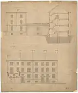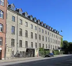 In the early 1870s, the foundation charged Vilhelm Tvede with the design of a residential project for the garden. He designed a single row of terraced houses inspired by English architecture. It was built in 187374.[1][2] The houses were originally rented out but were sold off individually in the 1970s. Former residents include the architect Hans Munk Hansen.[3]