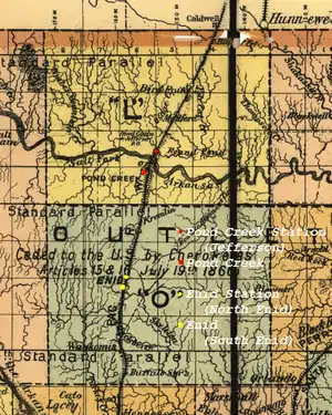 In the late 1880s, the Rock Island Railroad built a rail line into Indian Territory, entering near Caldwell, Kansas, and following the Chisholm Trail. Along the infrastructure, the company established railroad stations near a couple of the existing stage stations along the trail. The original stations, Round Pond, built at Pond Stage Stand on Round Pond Creek, and Skeleton Station (later known as Enid station), located in North Enid, Oklahoma near the Skeleton Ranch headquarters, would become involved in a controversy between the railroad, the new county seats, and the Department of the Interior.