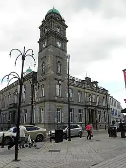 The foundation stone for the new building was laid by Lady Enniskillen on 2 May 1898.[4][5] It was designed by William Alphonsus Scott of Drogheda in the Renaissance style, built in limestone with Dungannon sandstone dressings at a cost of £13,000 and was officially opened by the Countess of Erne on 6 January 1901.[5] The design involved a symmetrical main frontage with five bays facing onto the Townhall Street; the central bay, which slightly projected forward, featured a Doric order portico with heavy oak doors and a fanlight; there was a balcony and a French door on the first floor with two pairs of Corinthian order pilasters supporting an entablature and a pediment with a coat of arms in the tympanum. In the north western corner of the building there was a six-stage tower with a copper dome.[2] In the third stage of the tower there were niches containing stone statues of soldiers from two local-raised regiments: the 6th (Inniskilling) Dragoons and the Royal Inniskilling Fusiliers.[6] Internally, the principal room was the council chamber.[7]