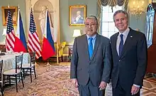 Enrique “Ricky” A. Manalo (born July 21, 1952) is a Filipino diplomat currently serving as the Secretary of Foreign Affairs under the Marcos Jr. administration since July 1, 2022.[3] He previously served in an acting role under the Duterte administration from March 9 to May 17, 2017,[4] when Perfecto Yasay Jr.'s ad-interim appointment confirmation was rejected by the Commission on Appointments due to citizenship issues.[5] He also previously served as Philippine Ambassador to the United Kingdom from 2011 to 2016, Undersecretary for Policy of the Department of Foreign Affairs from 2016 to 2020, and the 21st Permanent Representative of the Philippines to the United Nations from 2020 to 2022.[6]