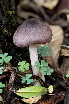The cap measures 1 to 5 cm (0.4–2 in) in diameter, and is convex or umbonate (having a central rounded elevation resembling a nipple). It is bluish-purple when young before reddening to a reddish-purple and eventually fading to a more purplish-grey colour. The cap surface texture is initially fibrillose (made of loose fibers) to velutinous (made of short, fine "hairs" that form a velvety surface), and then breaks up into small radially arranged fibrillose squamules (small scales) as it matures. The cap margin curves downward. Gills are closely crowded together, up to 6 mm broad, and have an adnate attachment to the stipe. They are white initially before becoming tinged with pink from the developing spores. The thin cylindrical stipe measures 3–7.5 cm (1.2–3.0 in) long and 0.2–0.6 cm (0.1–0.2 in) wide with a slightly thicker base. It is dry and brittle, hollow, and white or nearly white. The flesh is purple in the cap, and white in the stipe. The smell and taste are indistinct, although the latter has been described as peppery or radish-like.[3] Its edibility is unknown.[2]