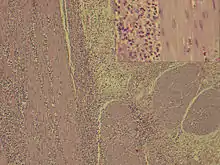 Eosinophilic gastroenteritis (EG or EGE), also known as eosinophilic enteritis,[1] is a rare and heterogeneous condition characterized by patchy or diffuse eosinophilic infiltration of gastrointestinal (GI) tissue, first described by Kaijser in 1937.[2][3] Presentation may vary depending on location as well as depth and extent of bowel wall involvement and usually runs a chronic relapsing course. It can be classified into mucosal, muscular and serosal types based on the depth of involvement.[4][5] Any part of the GI tract can be affected, and isolated biliary tract involvement has also been reported.[6][7] The stomach is the organ most commonly affected, followed by the small intestine and the colon.[8][9]