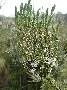 Epacris rhombifolia commonly known as mountain coral heath,[2] is a plant in the heath family Ericaceae and is endemic to eastern Australia. It is an erect, multi-stemmed shrub with broad, rhombic leaves and white flowers with four petals, the flowers spreading down the branches. It only grows in wet, subalpine heath and is sometimes regarded as a variety of Epacris microphylla.