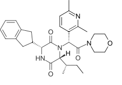 Screening the GSK compound collection and various libraries identified 2,5-diketopiperazines (2,5-DKPs) exemplified by 1 as novel and selective antagonists at the human oxytocin receptor (OTR). The lead, 1, showed potency of Ki = 300nM as a mixture of isomers in the amide side-chain. Initial structure–activity relationship (SAR) studies led to the semi-rigid and chirally pure 2,5-DKP 2 (Ki = 4nM), with cis disposed substituents at C-3 and C-6 and the R side-chain configuration at C-7. The optimal activity was shown to lie in the (3R, 6R, 7R) series (e.g., 2, 3) and an indanyl group was preferred at C-3, while at C-6, a 4-carbon branched alkyl was shown to be optimal.[4]