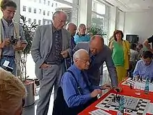 Ephraim Kishon at a simultaneous game of chess by Vladimir Kramnik, Dortmund 2001, left at the back of Kishon the President of the German Chess Federation (Alfred Schlya).