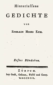 Kuh, who wrote more than 5000 poems, is believed to be the first Jewish poet to write in the German language.[1] Kuh was particularly noted for his mastery of the epigram in the tradition of Martial. A selection of the poems was published in Zurich after his death in 1792. They contain praise of Frederick the Great of Prussia, but also highlight the problems and indignities experienced by Jews in Germany.