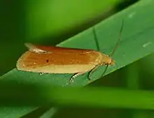 The wingspan is 10.5โ12 mm for males and about 14 mm for females. The forewings deep brownish ochreous, mixed with dark fuscous in males. The hindwings are blackish. In female, the forewings are reddish ochreous, with a few dark fuscous scales. The hindwings of the females are whitish.[2]