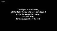In the build up to the episode's broadcast, cast members such as Rosie Marcel and Alex Walkinshaw gave interviews with press to promote the show's end.[12][20] Ahead of the episode's release, former cast members filmed good-bye messages to commemorate the end of Holby City.[21] The full details of the episode were kept a secret until it was broadcast.[22]