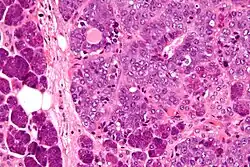 | Micrograph of an epithelial-myoepithelial carcinoma (right of image). The epithelial component has a tubular morphology and is evident only focally (upper left of image). Benign serous glands (parotid salivary gland) are also seen (left of image). H&E stain. | |
