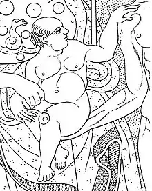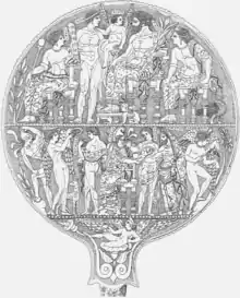 The Vulci Bronze Mirror has two registers, divine figures in the top register and Earthly figures on the bottom, a reare feature of the bronze mirrors. This is also one of the largest bronze mirrors that have been found.[3] The scene with the divine figures is the Presentation of Epiur to Tinia. Thalna is on the far left of the scene facing the right to watch the presentation. She is semi-nude, with her breasts exposed, holding a scepter, that may be in the shape of a pomegranate. Hercle is standing next to Thalna holding his club in one hand and Epiur in the other. He is nude with a diadem in his hair. Epiur is sitting in Hercle's arm as he is held out toward a seated Tinia. Epiur is depicted as an infant with the face of an older, balding man. He is also depicted nude, with wings. Tinia is seated on his throne, holding a thunderbolt in the crook of his arm. He is semi-nude with his chiton draped around his waist. Turan is seated on the far right of the scene. She is also semi-nude with her breasts exposed. She and Thalna are adorned with necklaces and earrings. A goose is next to Turan. The figures names are inscribed above their heads on the mirror.