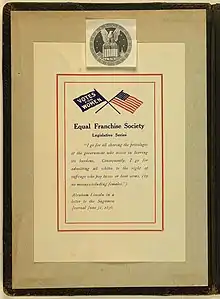 The Equal Franchise Society (EFS) was a state-by-state organization that advocated women's suffrage in the United States.[1] Created and joined by women of wealth, it was a conduit through which the energies of upper-class women could be channeled into political activism conducted within a socially comfortable milieu.[2] The New York branch of the Society, for example, often held suffrage rallies at which members spoke in the street outside the Colony Club, to which many of them belonged. After the public rally, Club members would eat luncheon inside their Club.[2] The EFS also invited anti-suffragists to meet with them for the purposes of debate.[3]