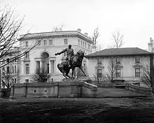 On March 2, 1889, Congress authorized the erection of a memorial to Sheridan and appropriated $50,000 for its construction.[4][5] The original sculptor chosen to complete the project was Sheridan's friend John Quincy Adams Ward, who had completed other works in Washington, D.C., including Major General George Henry Thomas and the James A. Garfield Monument. Ward signed a contract with the Sheridan monument commission in 1892 which called for the equestrian statue to be completed by 1898.[3] He submitted a sketch of the model in 1892, but that design was not approved.[4] Not only did Ward not complete the work by 1898, he had only completed a life-size study of Sheridan's head by 1903. Ward finally completed a model of Sheridan, but when Irene and her son, Philip Sheridan Jr., visited Ward's studio in New York City to see the model, they both hated it. He was depicted as a stout older officer atop a stilted horse. The commission eventually cancelled the contract with Ward in 1905. His model of Sheridan was eventually cast in 1916 and stands in front of the New York State Capitol.[3]