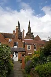 Darwin purchased a medieval half-timbered building on the west side of the lower courtyard of the Vicars Choral in 1758. From 1758 to 1759[1] Darwin converted the building into a large Georgian town house of red brick with stucco dressings and Venetian windows.[2] At this time the front of the house was separated from Beacon Street by a narrow deep ditch which once formed the moat of the Cathedral Close. Darwin built a bridge across the ditch descending from his hall door to the street. The ditch was overgrown with tangled bushes, which Darwin cleared and made a terrace on the bank. He planted the ditch with lilacs and rose bushes which screened his terrace from passers by.[3] After Darwin left in 1781 the next owner filled in the ditch to make a driveway from the street to his doorway.